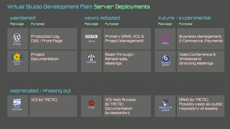 Although the authoring software, like Blender, Inkscape, and Audacity, tends to be the sexy part of our project’s software, a lot of the more mundane communications and management software is really critical, and that’s where we’re currently weak. I hope we can resolve some of that this month and next with Sylvan’s help!