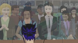 As with most GL renders, this has loads of artifacts and markers rendered (some of which are useful to me). But these renders are great for getting animation and timing correct. For this purpose, I don’t care that the compositing leaves green lines around the characters. And it’s very quick — I can now work with the viewport renders which take just seconds or minutes to render (they’re not quite real-time on my workstation, but there’s not a lot of waiting). That means it’s easy to go through the cycle of making changes and then seeing how they look in motion — a critical thing for animation quality.
