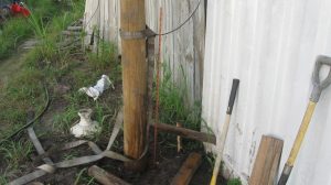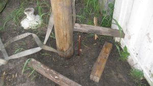 We also started preparing for our first concrete project, which is to put in a pier to replace the rather-makeshift column arrangement supporting the roof on our house. You can see the buckled “knees” on the existing supports. We’re replacing the alternate ones (currently unconnected) with a new “buttress” design that should be able to take some lateral thrust.
