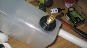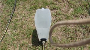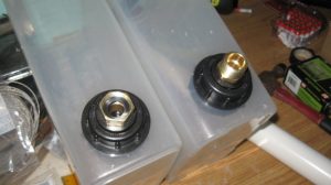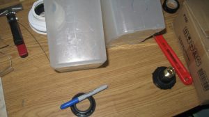 Water levels are an ancient technology for getting true level on large structures. The pyramids were probably leveled this way, by digging trenches and filling them with water — it gives a very good true level. With a 150-ft garden hose, this level can be used for pretty large structures. I think I spent less than $50 on parts (the bulkhead fittings are about $15 each, plus M/F hose adapters for each, then there’s the hose itself and the cereal containers, but I already had those).