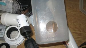 This month, I constructed a water level based on a couple of old dry-goods containers and a garden hose, using bulkhead fittings from the hardware store. It works! I was able to make a series of two point comparisons for all four corners of each of the ocean storage units that comprise the studio.