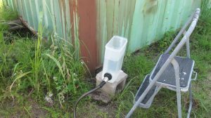 to use it to put level marks on all four corners of each of the storage containers for the library/shop complex. This a step towards leveling the units. I also ordered railroad ties which we’ll need for supporting the units during leveling.