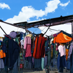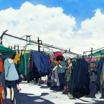But let’s see what MidJourney can do for me, with a prompt like “an open-air market with racks of clothing for sale, anime style”: