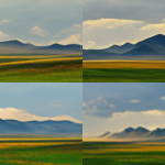 I have a very simple backdrop for the distant plain and mountains seen in the train sequence at the beginning and some more at the spaceport. It wouldn’t be too hard to slip in replacements, and MidJourney can do some nice things “steppe grassland with mountains in the distance”: