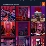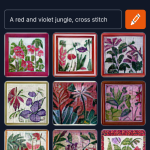 Then I tried a large range of stylistic variations on the same simple prompt “a red and violet jungle” (the success with the skyline above suggested that some of the style prompts might work on Craiyon much as they do on MidJourney):