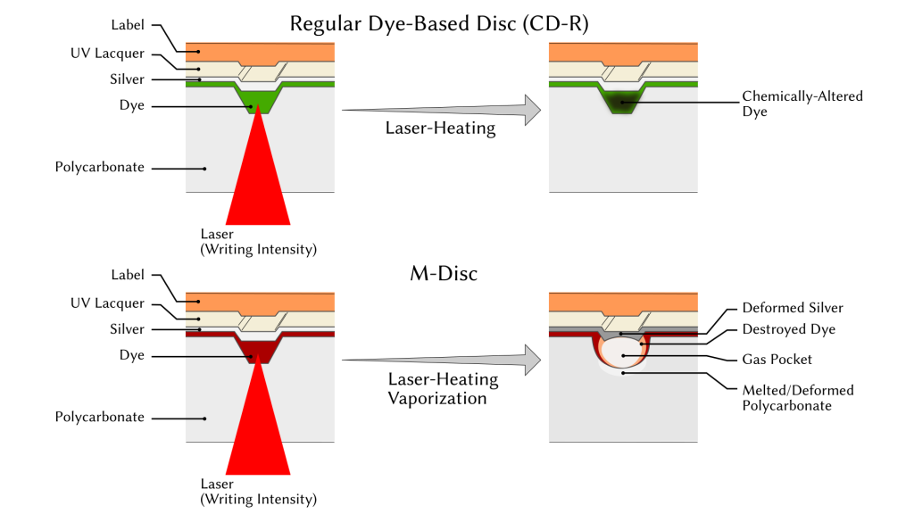 Writing to these discs does produce physical pits — essentially air pockets, which are much more durable than the scorch marks on dye-based media, and can’t fade. The writing energy from the laser in M-Disc compatible drives produces these pockets.