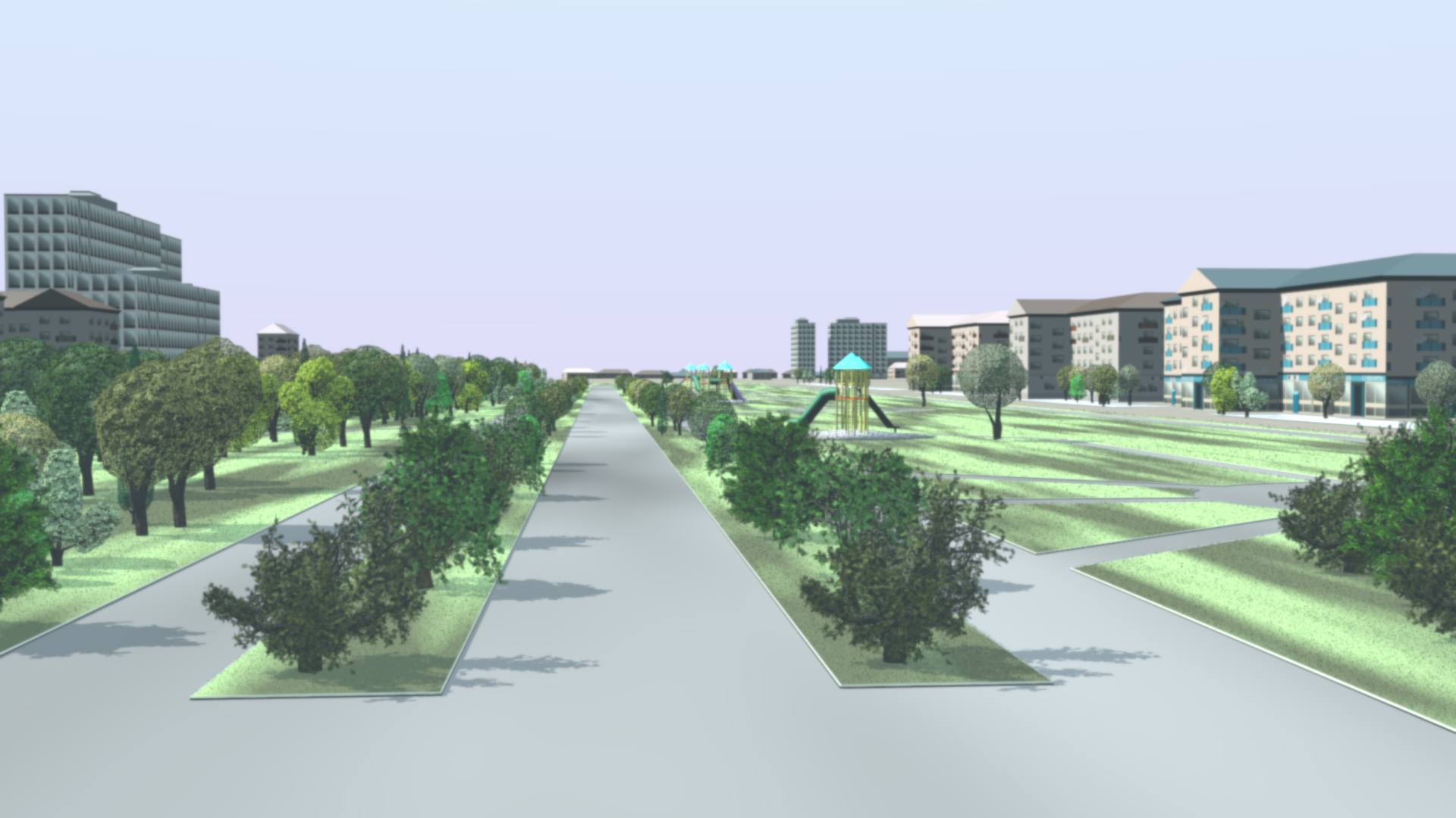 Sathish Kumar, our principle set modeler, and his Spark Multimedia studio is starting on the foreground sets. Meanwhile, I’m starting work on the background sets. The image associated with this article is a render of a proof-of-principle test I did based on the setting for the “Stele to Science and Space”. The monument itself is missing, but this fills in features from the park and surrounding buildings. My plan is to render these elements with cel-shading, but no outlines, since they are meant to be perceived as part of the background plate, with a focus on color rather than definition of details.