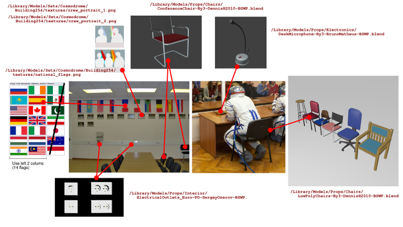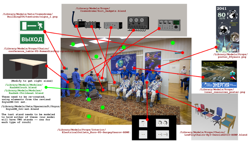 A lot of direction takes the form of me creating marked-up drawings and photo reference sets — at least for the sets where we are dealing with real places and things. The pictures below, for example, are ones I created for Sathish Kumar, who is doing set modeling. It shows a photo of the real “Aquarium Room” at the Baikonur Cosmodrome, and stock-models and props we’ll be using for set-dressing: