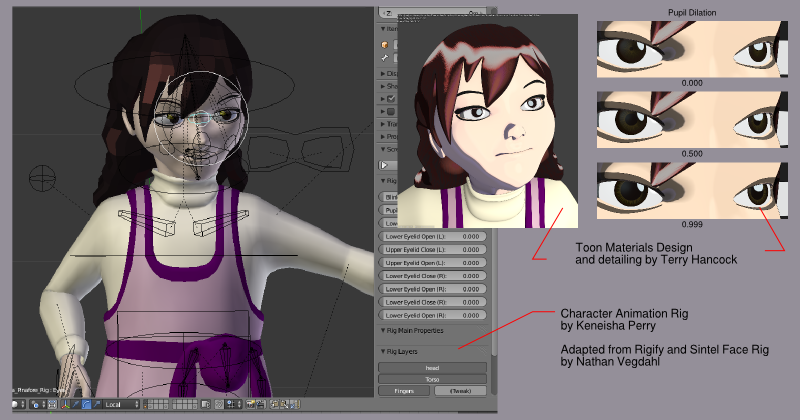 Unposed character models with default “plastic” textures look very unimpressive to audiences, so we haven’t really been able to show off all of the character modeling work as much as we would like. Also, after looking at early results with these models, I decided that I really needed to work harder on getting the “toon” look for the characters that I had been hoping for. So, I put a lot of work into materials for the Georgiana character. And finally, of course, the characters need body and face animation rigs. We were hoping to be able to use an existing rig for this, but the best we could do was to adapt the Rigify body rig and a modified version of the face rig used for Sintel (in the Blender Open Movie of the same name). Keneisha Perry was just learning Blender rigging at that point, but put a lot of effort into it, and we we now have an excellent rig for the Georgiana character. Furthermore, we can use this rig as a basis for all of the character rigging for our production.