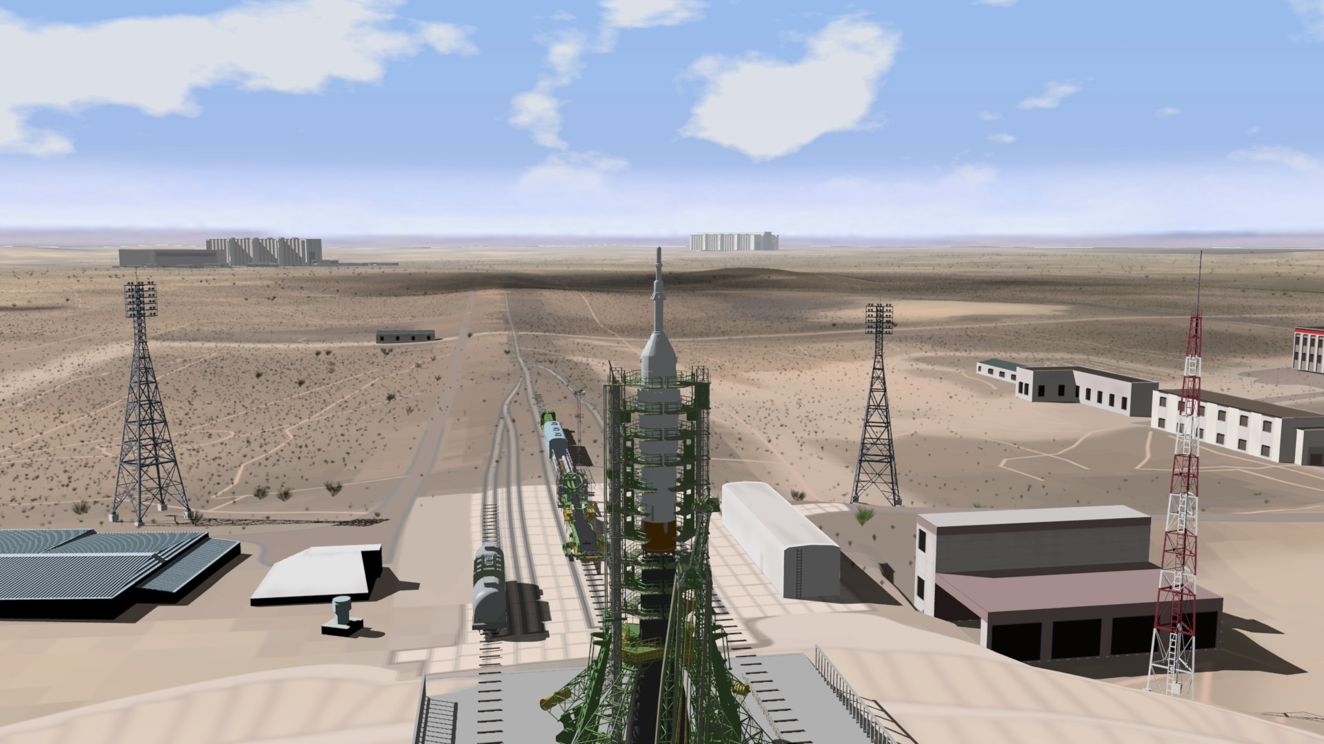 And this shot is the reason we needed such a large virtual set. From up above the Soyuz gantry, you can see a long way — I actually calculate about 35 kilometers, in real life, which we cheat a little bit on, using a backdrop for the far background.