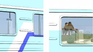 The camera tracks across the windows of the train, revealing some landscape details behind the camera. We see modern windmills, which we imagine to be more common in 2040, even in remote locations (perhaps especially in remote locations). There may actually be some of these in Western Kazakhstan today, but I didn’t research that.