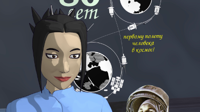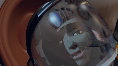 This shot is an unaltered piece of our earlier “teaser trailer” demo, which used a little bit different (more photo-real) animation style. This didn’t look as good, but in order to re-do these shots, we have to finish revising the Soyuz interior set, which has not yet been finished. The spacesuited figures don’t show any faces, partly because we haven’t updated those models yet.