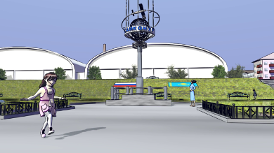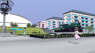 As the camera pans, we can see the “Cosmotrans” steam train on display, as well as some of the background buildings, which I was frankly surprised held up as well as they do — like the buildings at the launch pad, these are little more than boxes with textures on them to provide detail.