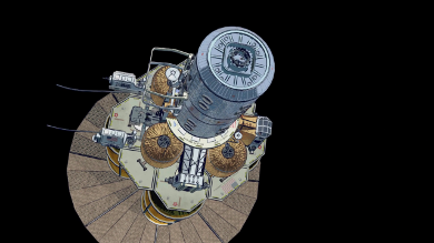 I’ve been using this “look and feel test” shot of the Soyuz pod-staging sequence for sometime now. It’s not quite complete — in the episode, the Soyuz will have decals added. We may also try to make the pod escape sequence more accurate. Although in our depiction, the pod simply comes straight down, and then peel out in a petal formation, they actually pop out from the bottom first. I didn’t really think anyone would notice the discrepancy, but somebody caught us, so I guess it’s more visible than I thought!