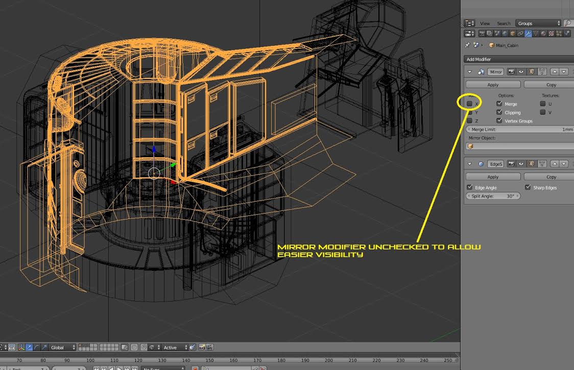 Terry Hancock collected many photographs of the real site and drew a floorplan based on those, then Sathish Kumar took over and created this 3D model of the set, based on those sources. It already looks very good, although there is quite a bit to do in finishing up materials and textures. There are also some missing props — the clock, some lighting strips on the walls, and so on. We’ll also need to see what it looks like with Freestyle lines turned on.