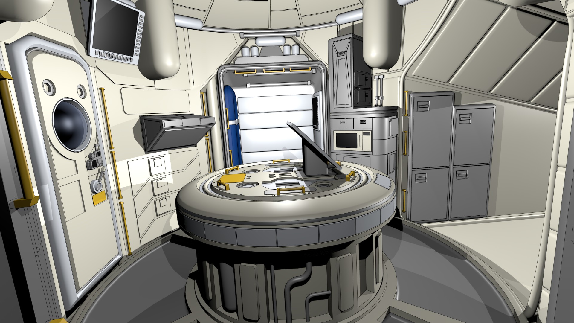 The LTS Lander is meant for use in low gravity and no gravity, and the interior is laid out accordingly. The cockpit presents an interestingly challenging geometry. Since I decided to eliminate a separate “command module”, and simply run the Service Module from a console on the Lander, things get interesting.