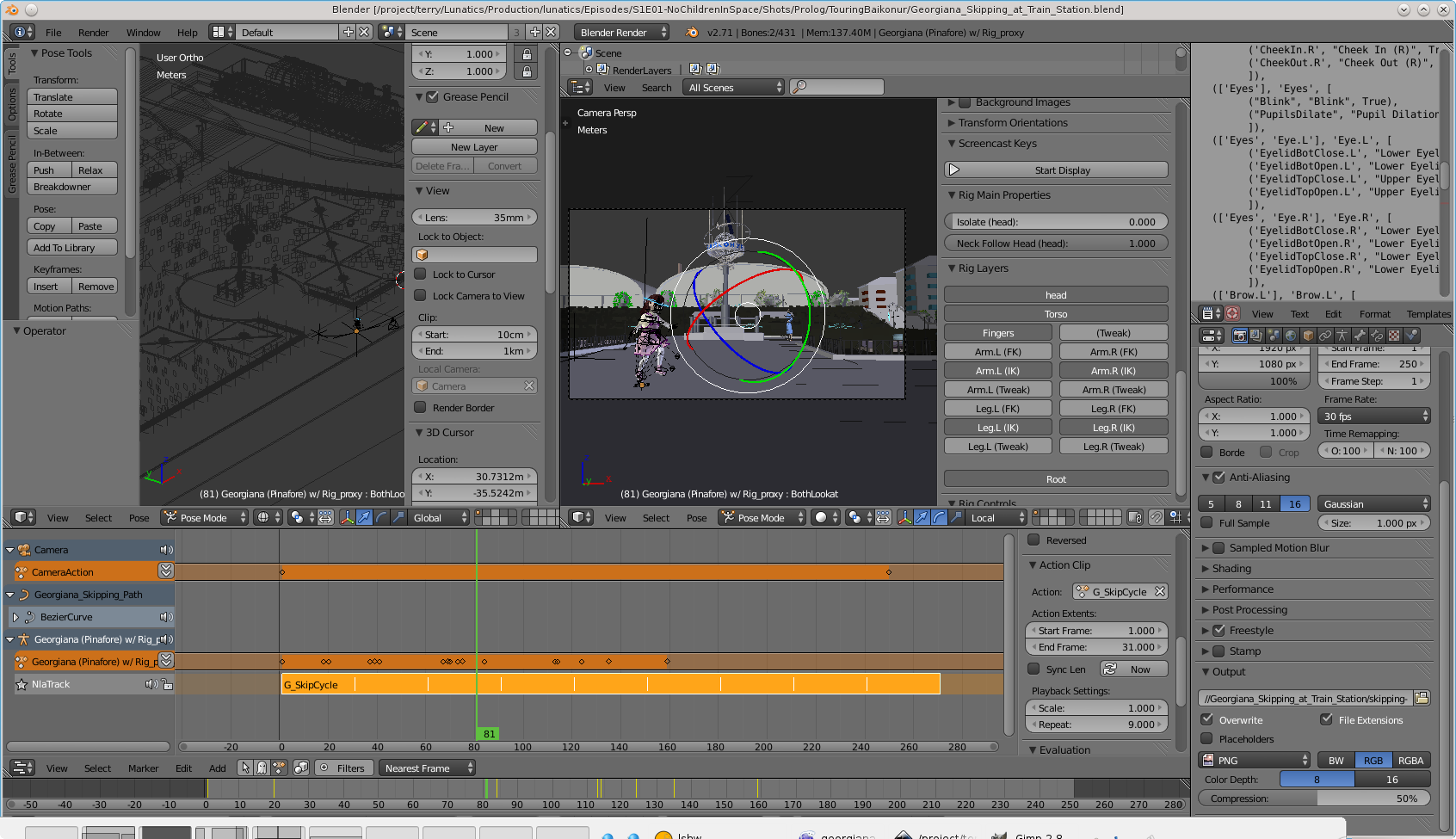 Cyclic animation test of Georgiana skipping, created by Terry Hancock with the Action Editor and NLA Editor. This cycle was also used for the skipping shot in the Patreon trailer, although additional head and body motions were overlaid on it using the NLA Editor.