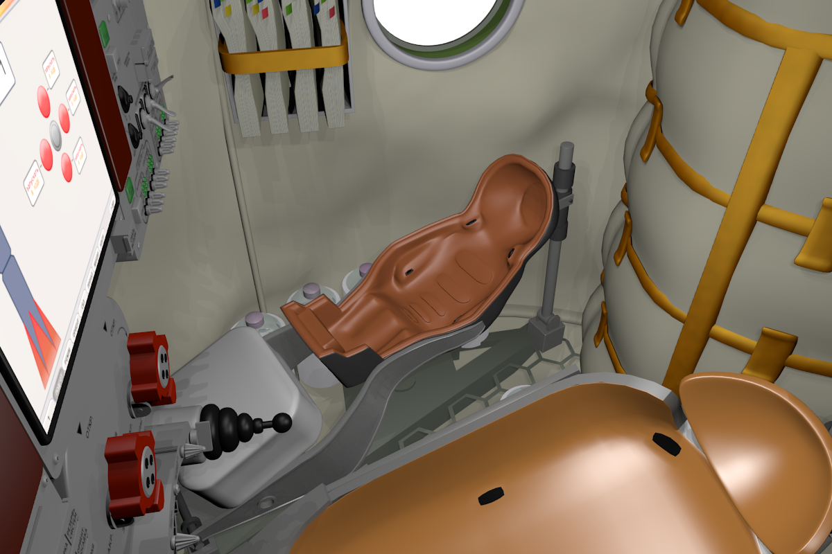 It also reduces the “uncanny valley” effect, giving us a little bit more tolerance for simpler character animation.- SLIDE 17 – Soyuz cabin