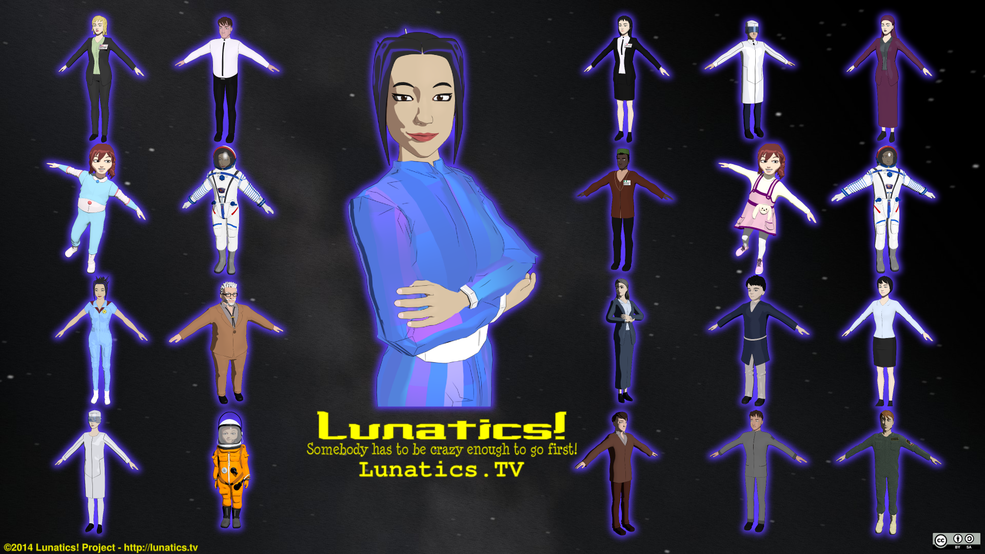 This month we’ve been doing check-ins and reviews on work completed by the three CSU Interns we hosted over the Summer. And we’re getting things organized for Fall, including the assets we need for animation, and organizing publicity events. Producer/Director Terry Hancock and Writer Rosalyn Hunter attended the first annual “Dallas Blender 3D Symposium” and presented a brief “Introduction to the Lunatics! Project”. Although the original video from this talk was lost, we are including a slightly-revised version of the talk in this Newsletter, along with some explanatory notes. We’re also taking a look at our character development progress, including the 22 fully-rigged character models that have been completed so far.
