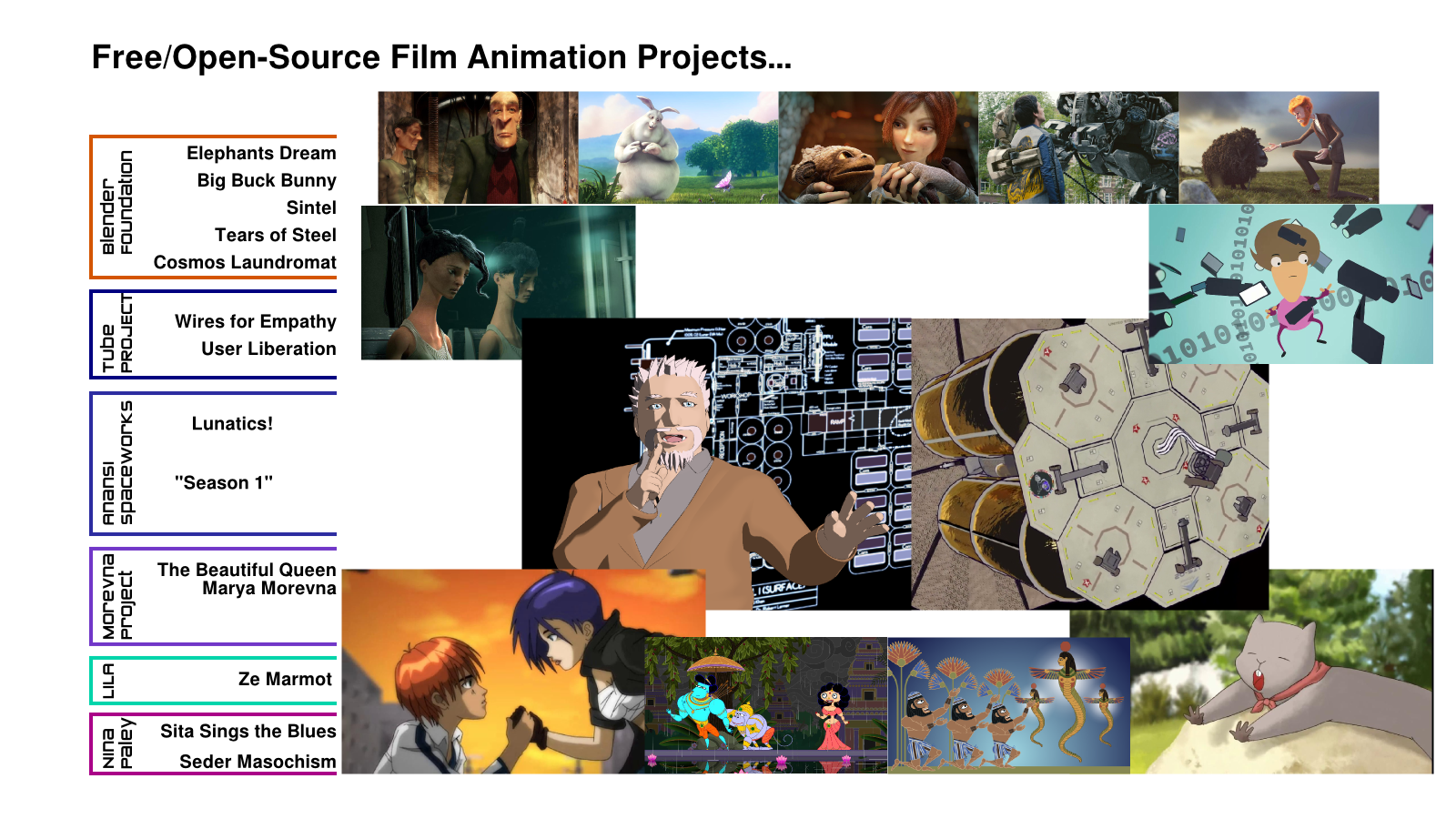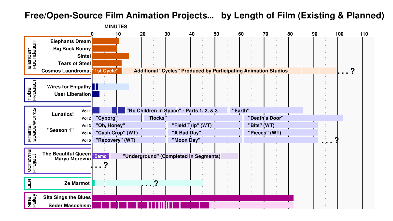 Identities of the Free-Culture film projects for comparison (i.e. who’s making them). Now, I want to show you where we fit into the “Universe of Free-Culture Animated Films”. These are the projects we regard (more or less) as peers.