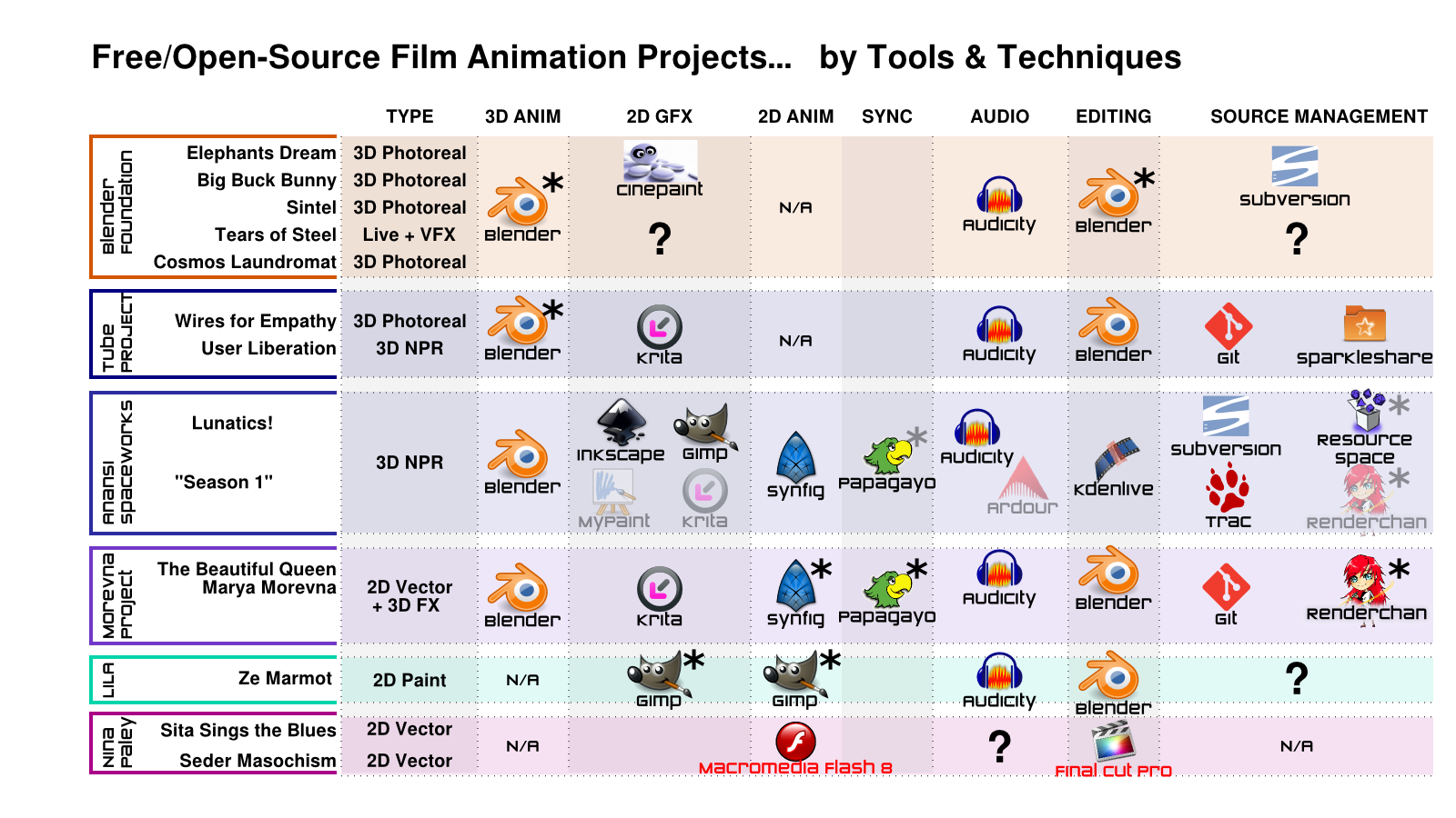 Software tools for Free Culture film projects. One way to compare projects is to look at the techniques and tools we use. This chart includes both 2D and 3D animation projects, and of course, one live-action project with VFX.