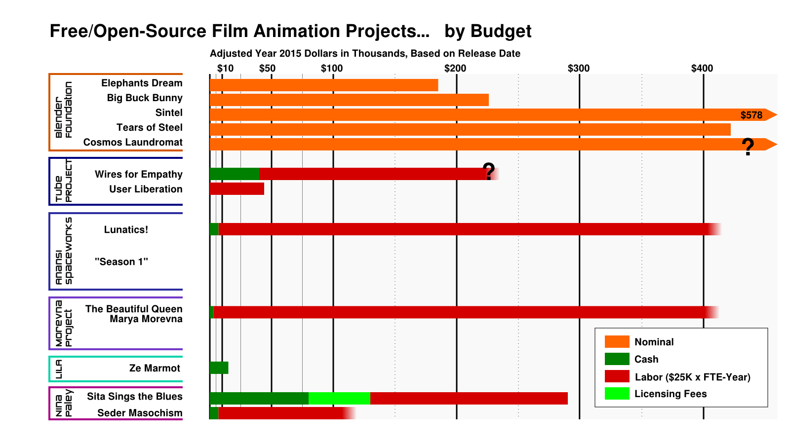 For the other projects, I’ve broken the budget into “CASH” investments and “LABOR” investments (what is sometimes called “sweat equity”). These projects have people working on them as volunteers, interns, or as an investment towards some cut of future profits (if any). This, I thinks for a much-more fair comparison.