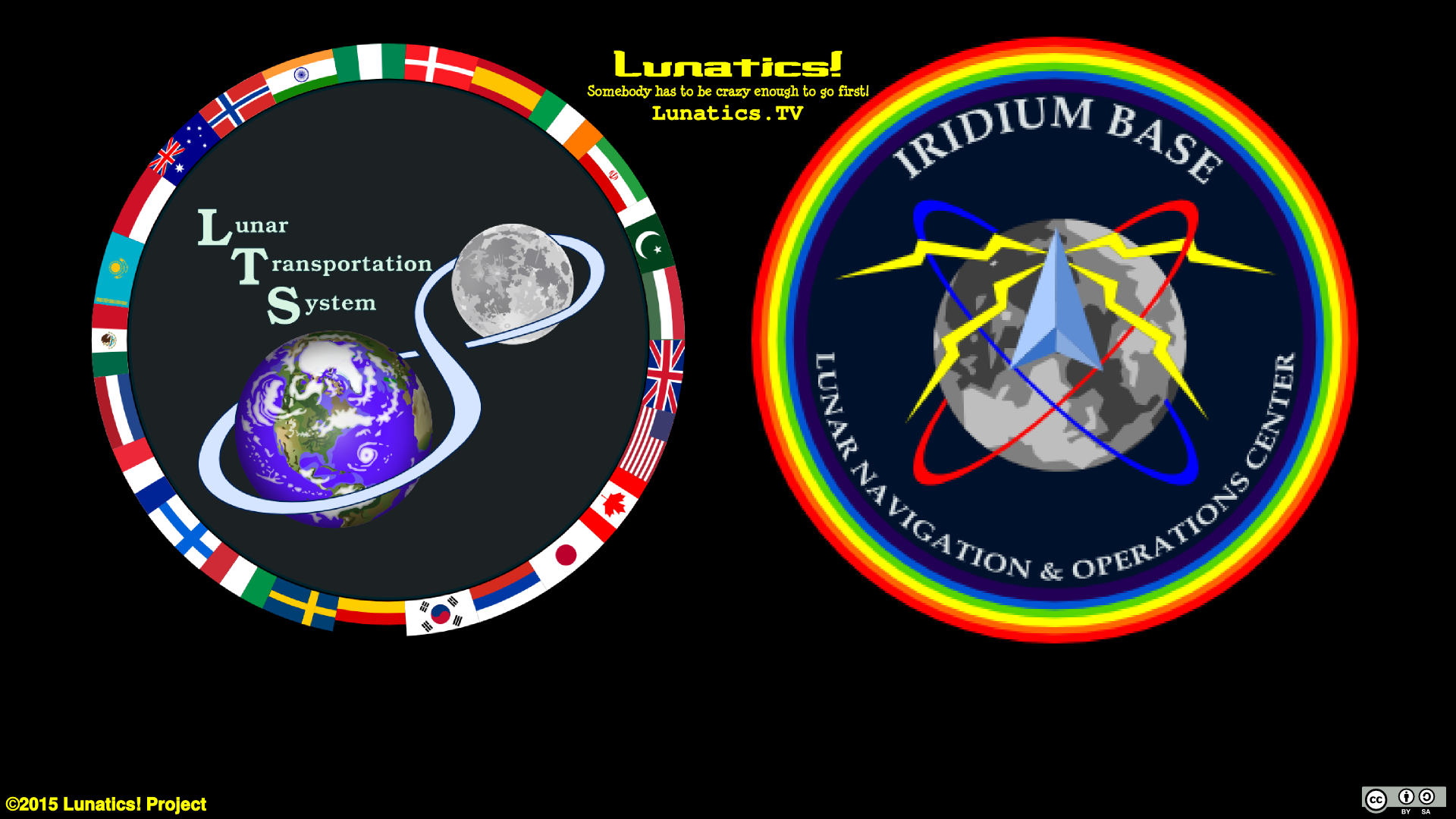 “Patch” or “Seal” graphics displayed on the big monitors at the front, for the Lunar Transportation System international partners and the Soyuz SF-19 flight on which Hiromi, Georgiana, and Sergei go into space.
