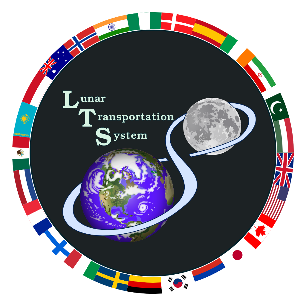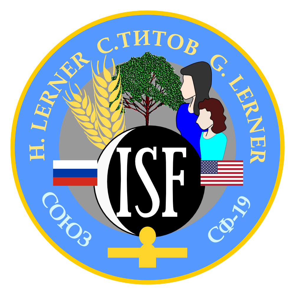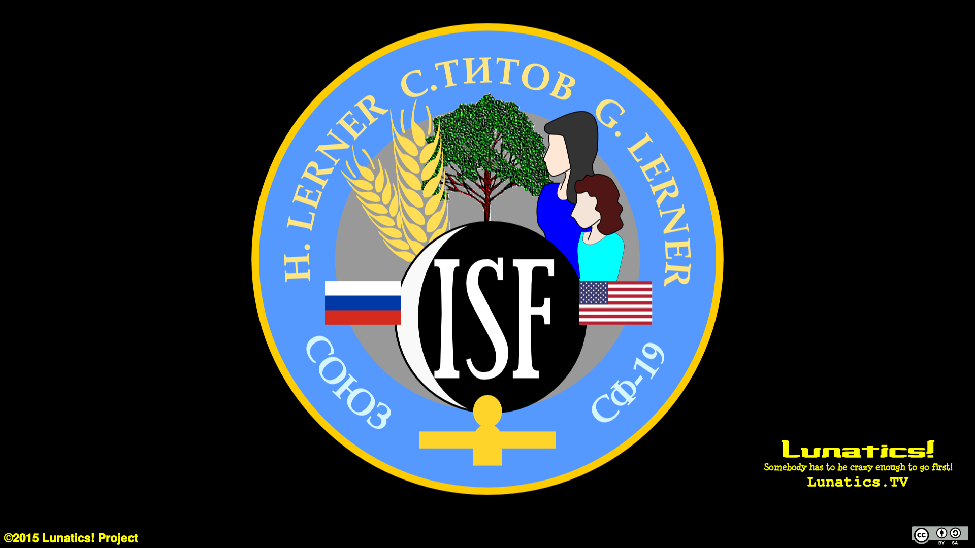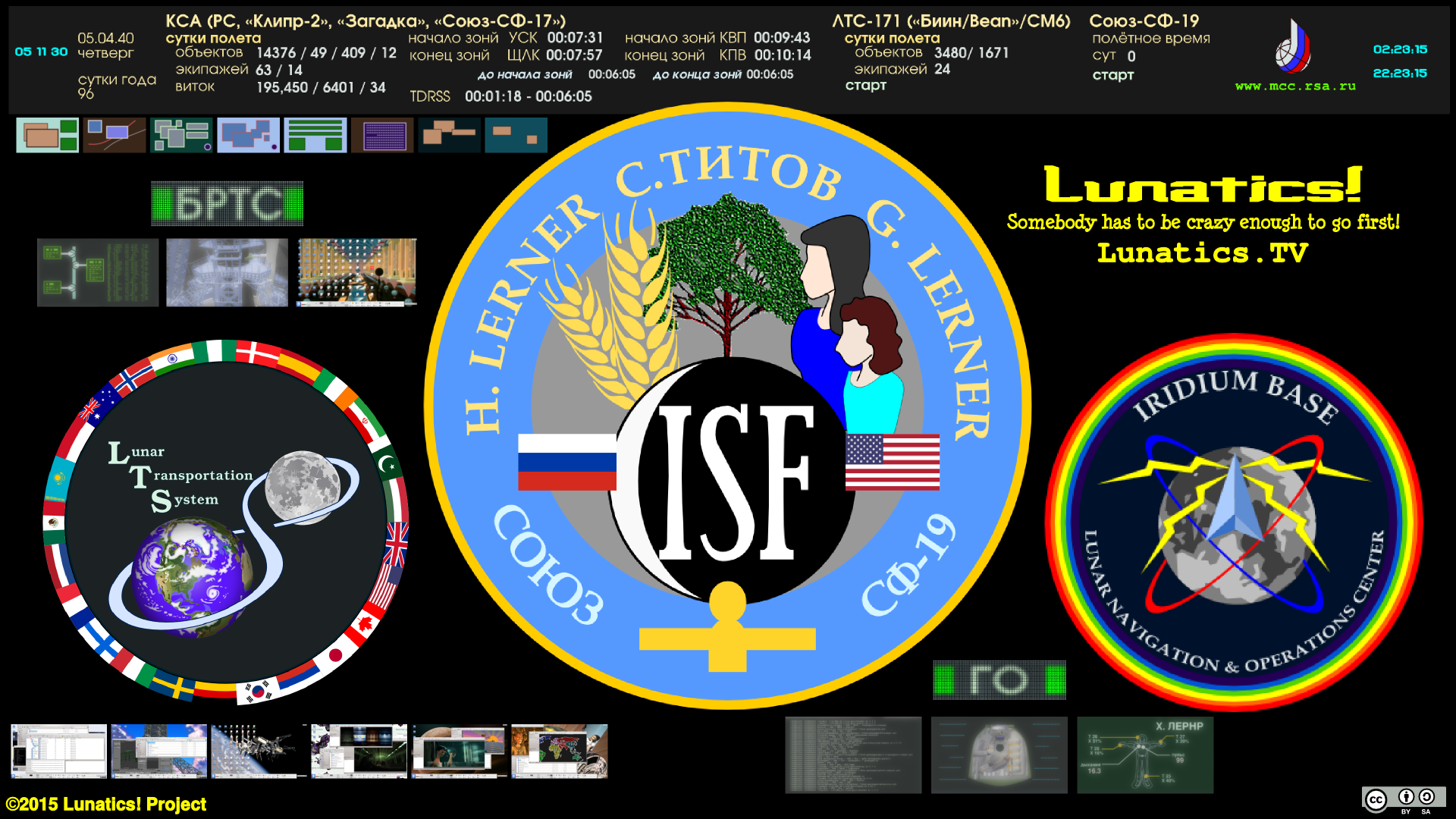 “Patch” or “Seal” graphics displayed on the big monitors at the front, for the Lunar Transportation System international partners and the Soyuz SF-19 flight on which Hiromi, Georgiana, and Sergei go into space.
