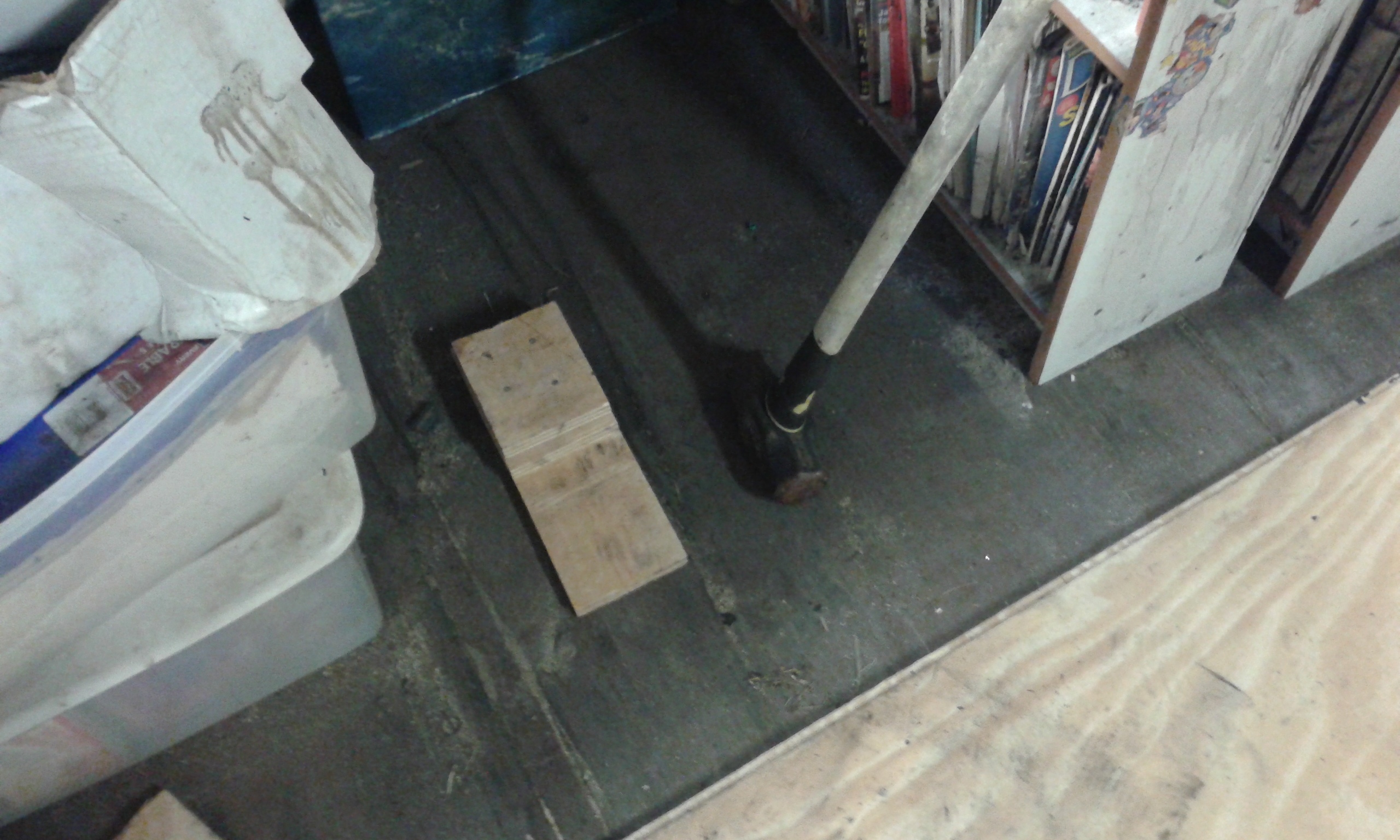 Started installing floor panels in the studio library. We’ve cleaned out the fire damage from 2013, and are laying down plywood tongue-and-groove (“T&G”) subfloor, which smooths out the rough floor of the cargo container. This is the first step of construction, since the wall framing will sit on these panels. I used the sledgehammer, with a small piece of grooved plywood to tap each panel into position, engaging with the previous panel. Since we have limited storage, I had to do this part of the job in stages, clearing the floor into the front of the unit, then moving everything back, after the panels are installed.