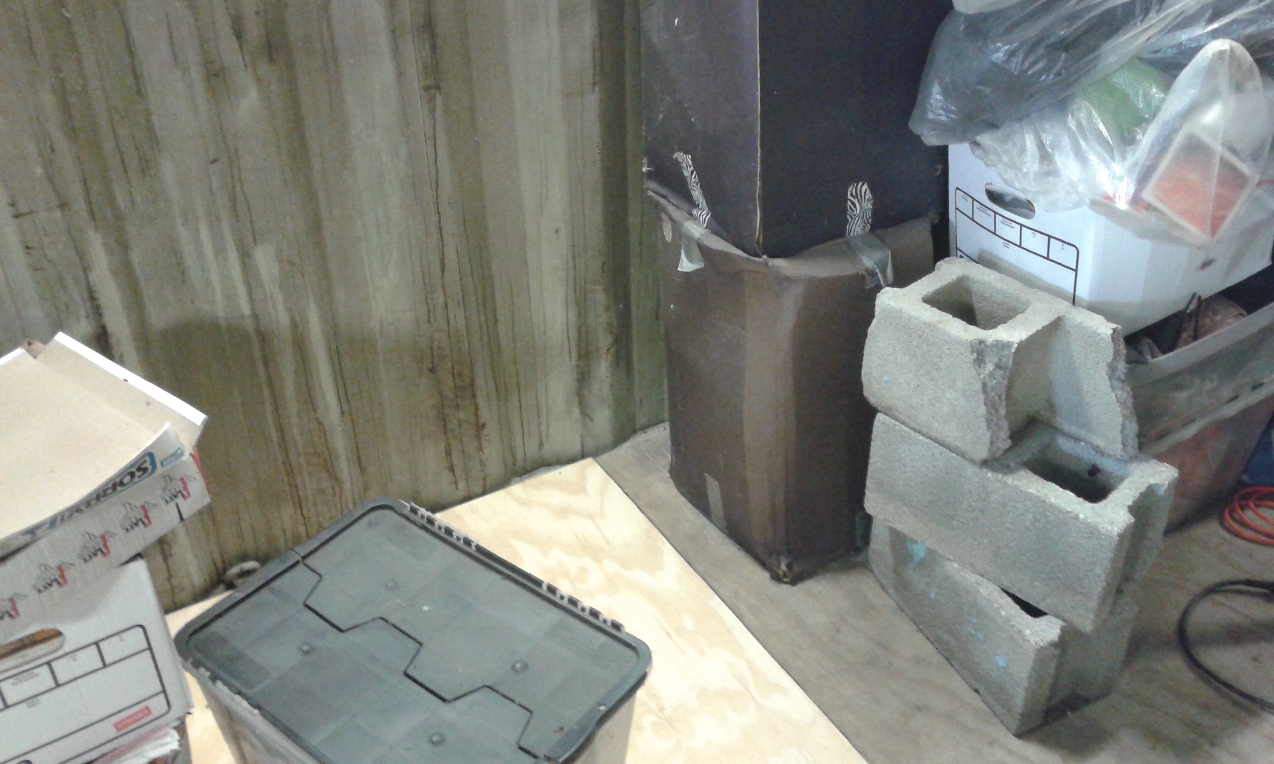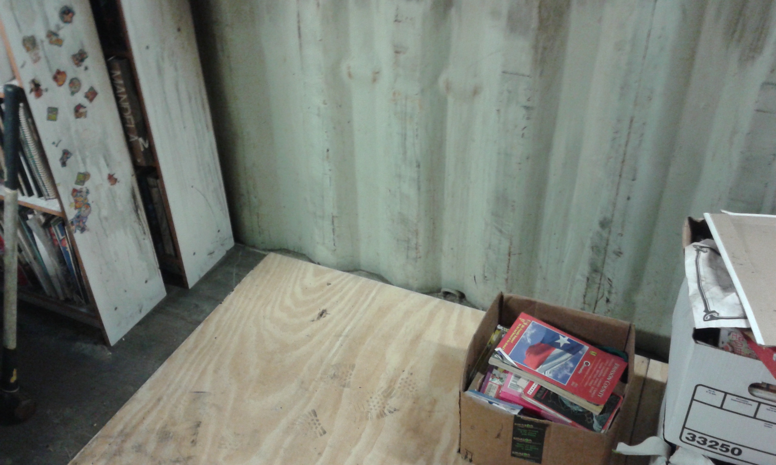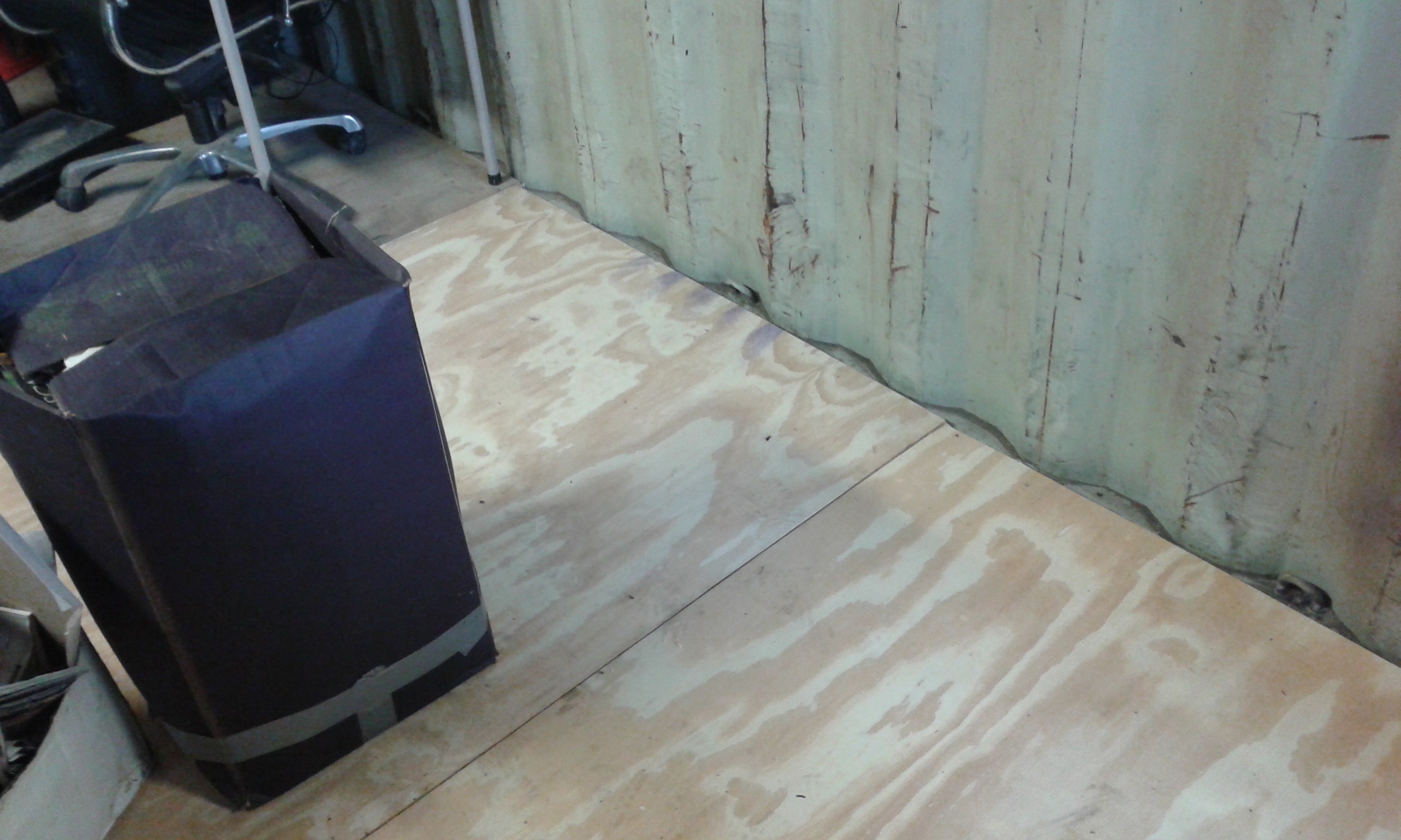 Started installing floor panels in the studio library. We’ve cleaned out the fire damage from 2013, and are laying down plywood tongue-and-groove (“T&G”) subfloor, which smooths out the rough floor of the cargo container. This is the first step of construction, since the wall framing will sit on these panels. I used the sledgehammer, with a small piece of grooved plywood to tap each panel into position, engaging with the previous panel. Since we have limited storage, I had to do this part of the job in stages, clearing the floor into the front of the unit, then moving everything back, after the panels are installed.