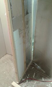 Note that there are very few connections between the inner and outer wall support, with a layer of insulation in between. This reduces the transmission of sound vibrations from the outside into the booth. The room is also not rectangular, so that the walls do not set up a resonance between them (couldn’t do much about the floor-to-ceiling space, though I did tilt part of the ceiling space for this reason). This is to break-up internal sound reflection — of course, I would also install damping foam and carpeting.