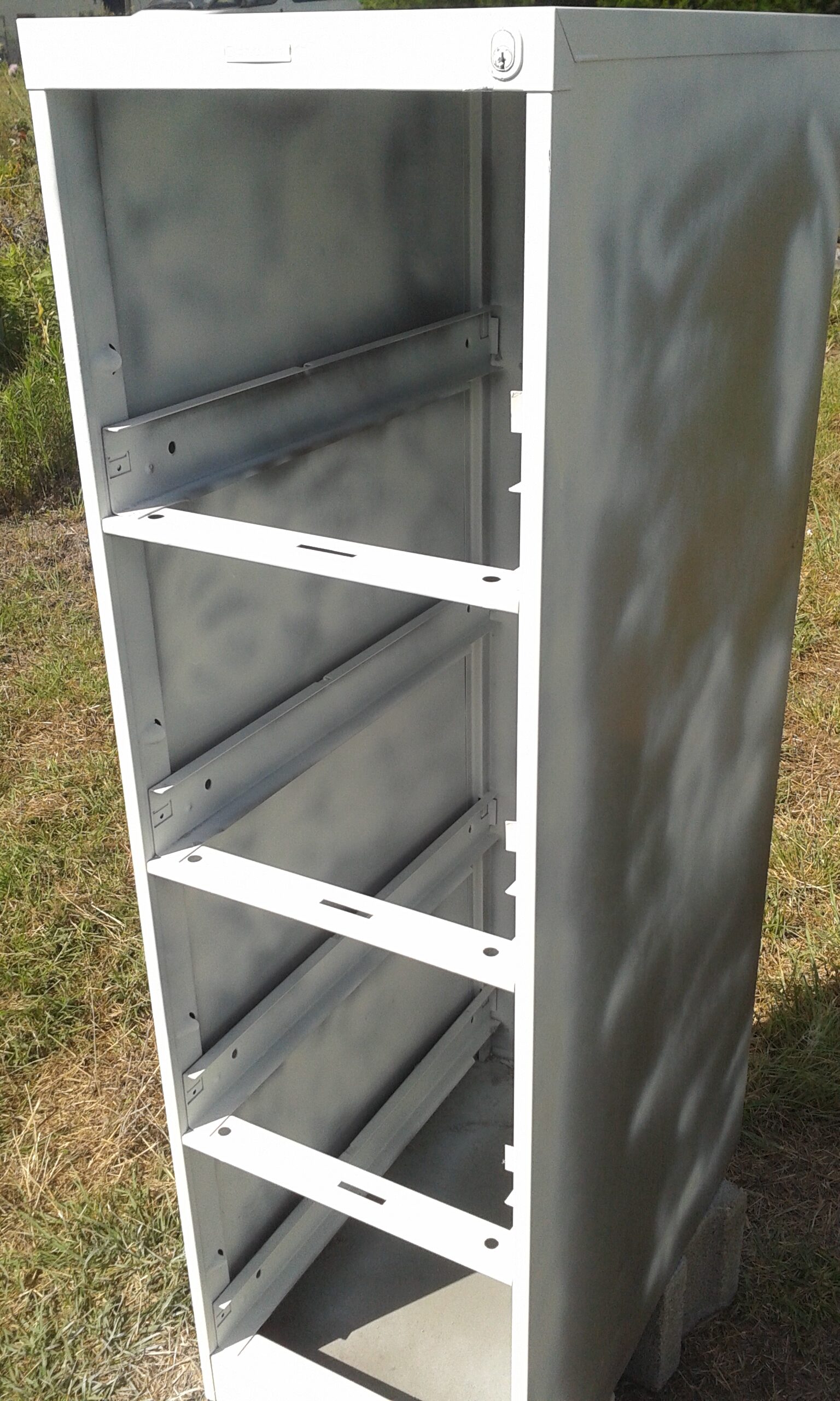 A major problem to solve were the file-cabinets. The paint was bubbled and peeling and there was a lot of rust on them. But I decided to recover them. So I disassembled them, and used heat guns and wire brushing to remove the old paint and rust, and then gave them a new paint job: