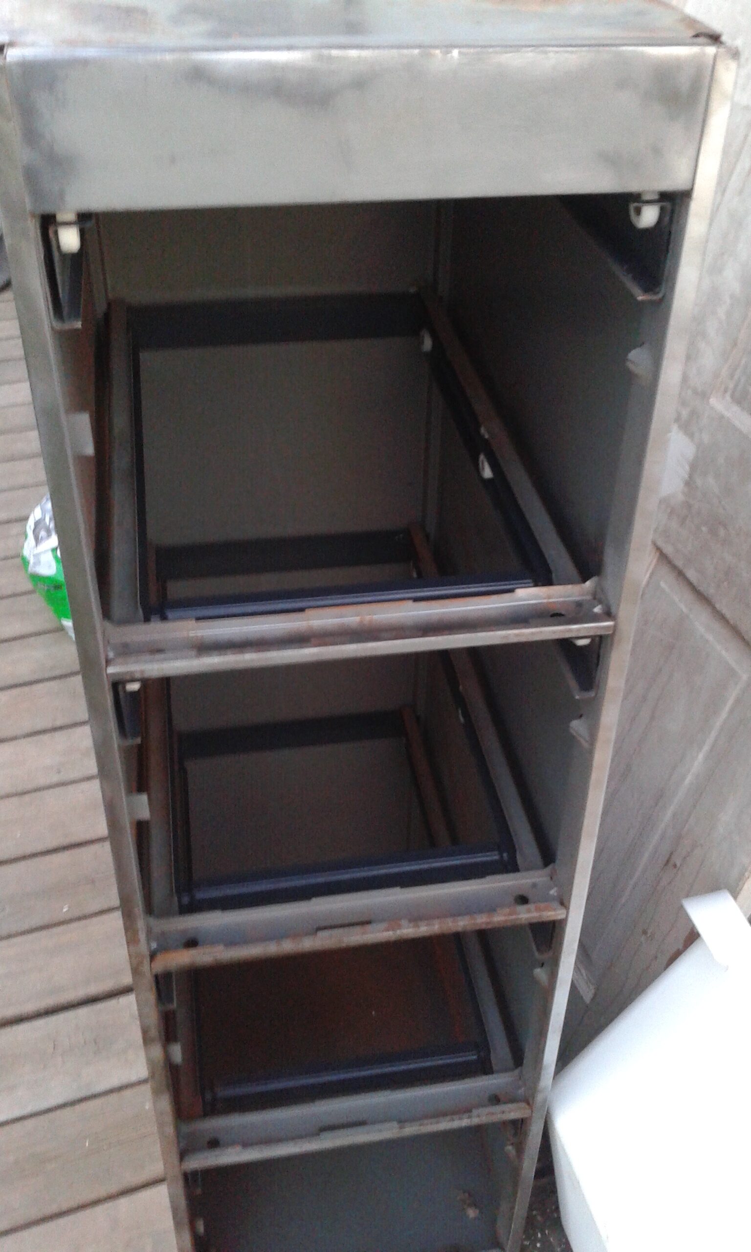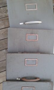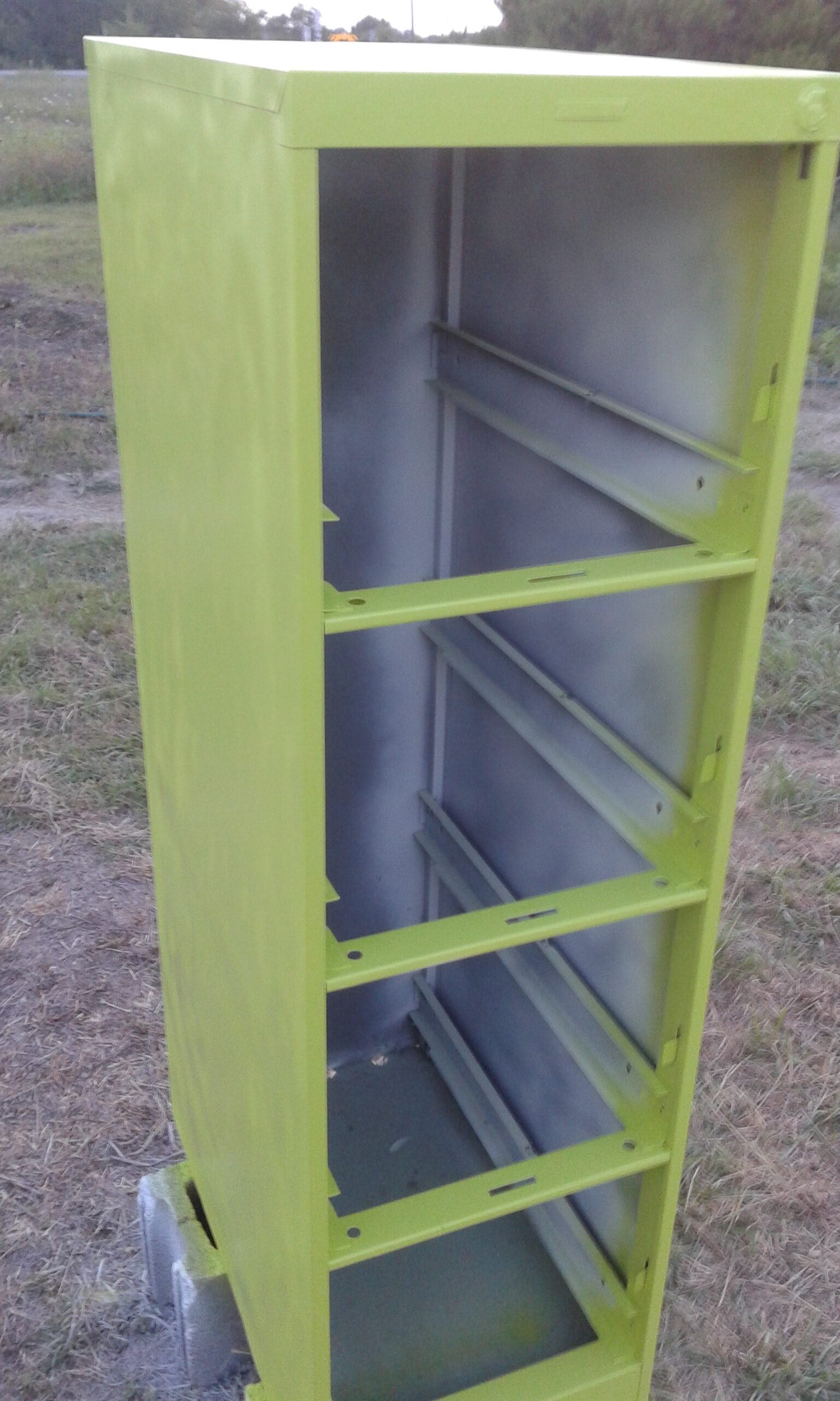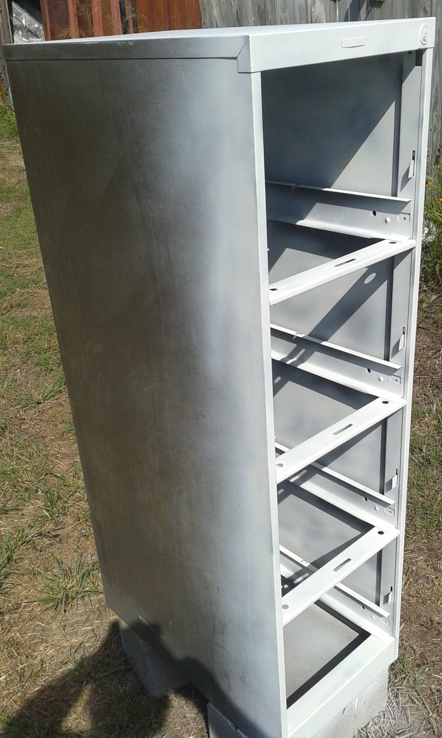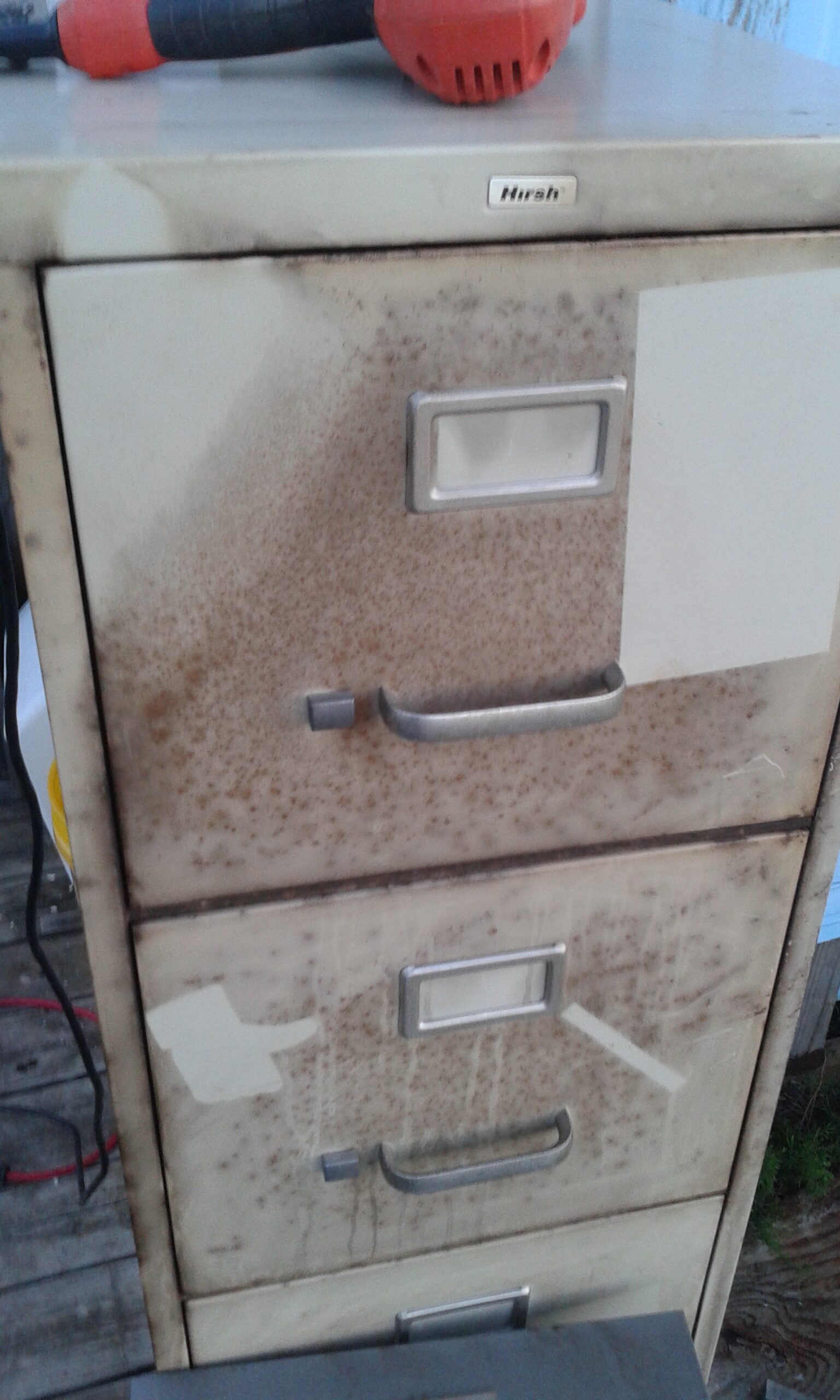 A major problem to solve were the file-cabinets. The paint was bubbled and peeling and there was a lot of rust on them. But I decided to recover them. So I disassembled them, and used heat guns and wire brushing to remove the old paint and rust, and then gave them a new paint job: