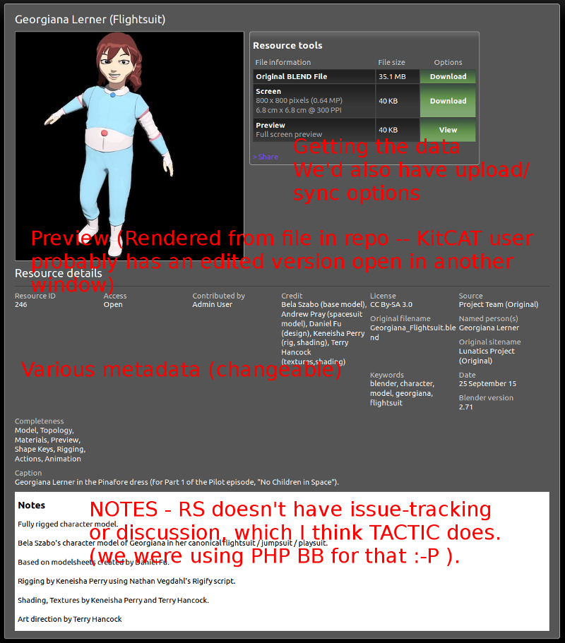 Marked up web-based user interface for ResourceSpace, which I used in a discussion with Katrina Niolet about creating a Qt-based client for TACTIC which should have some of the same features. This was to be called “KitCAT”, originally a play on reversing “TACTIC” (except for the “K”), but which I later expanded as “Kit for Creative Arts Teamwork”. This has not gone past the mock-up phase, but still seems like a decent idea if we could find the time and/or money for developing it.