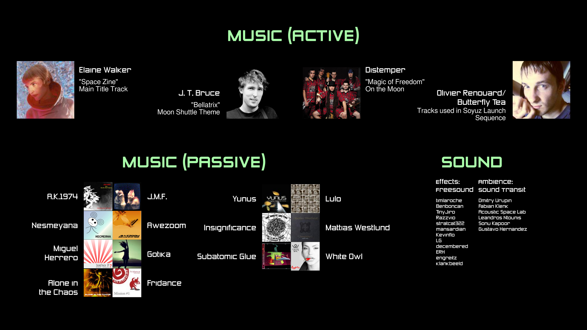 I’m always a little hesitant to get specific about contributors: I want to make sure not to leave anyone out. But I also have to avoid implying too much connection, particularly for peripheral contributors like the musicians whose music we’ve appropriated under the free-licenses they’ve released them under. They may not have heard of us, and who knows if they would endorse the project, so I don’t wish to imply too much!