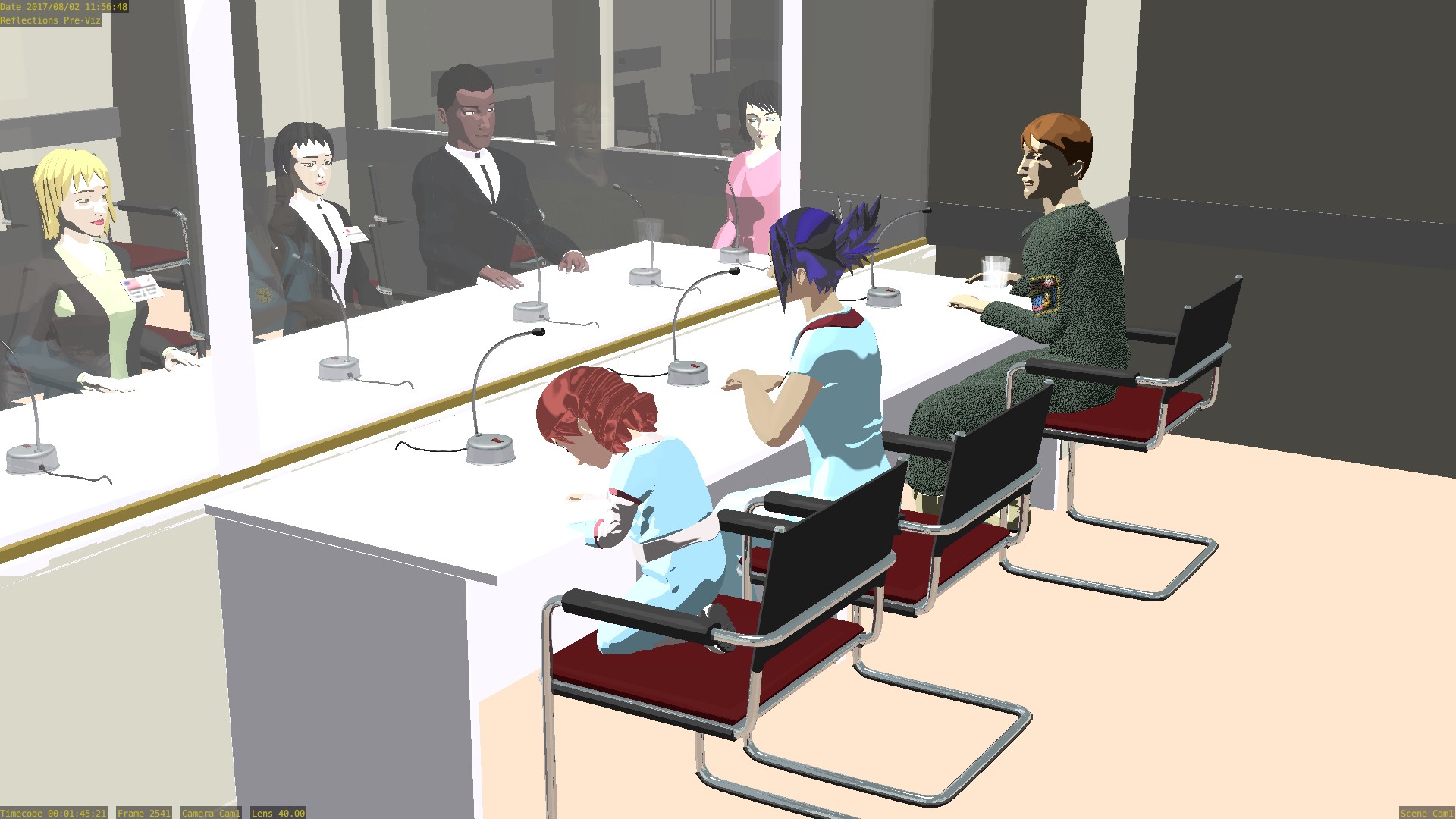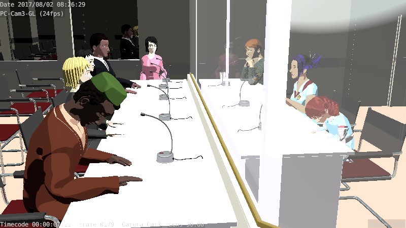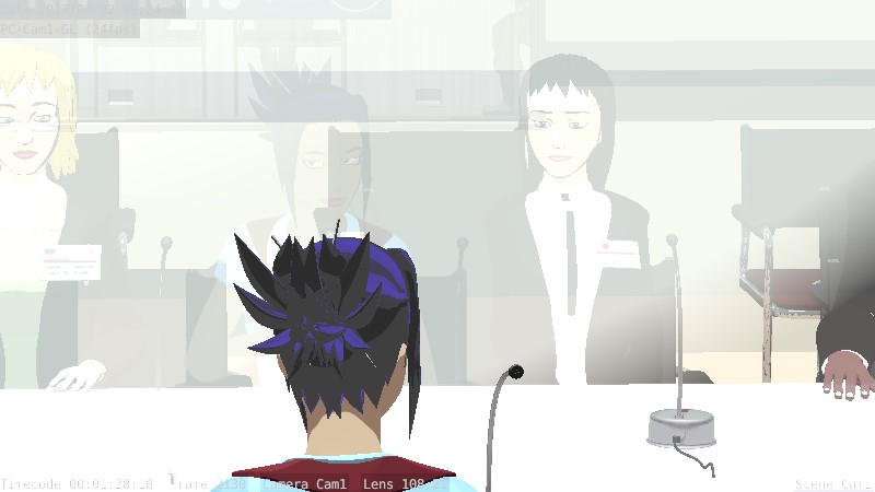 - First render tests of the “Aquarium Room” set and the “Press Conference” blocking.