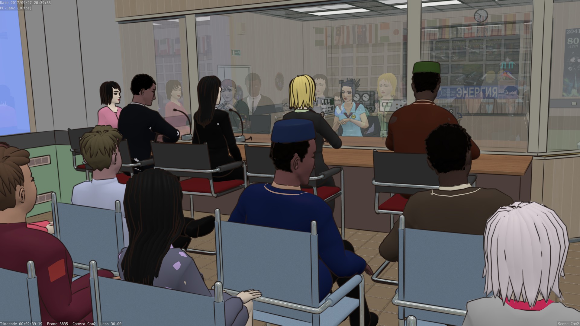 After many months of neglect, I am finally putting together the pieces for the “Press Conference” scene. In my previous post, I showed how the compositing works. I’m not done with all the IT and hardware work, but I decided to take a break and do some of the creative work, partly for my own sanity, but also so I have more to show here. So here’s a peek at a few of the better test renders from the fully-assembled sequence. There are still a number of problems — the technical reason for these renders is for me to catch those. Some props are out of place and some of the character meshes have interference problems. We’ll be tweaking those things. But it already looks pretty good: