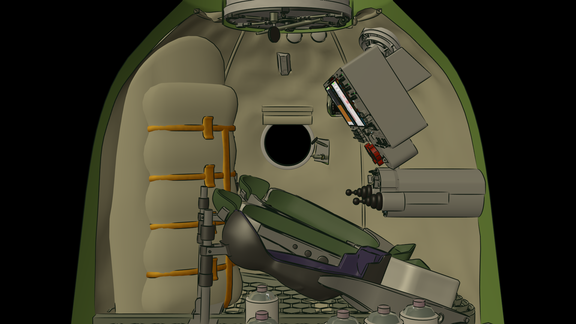 This is the updated / rebuilt Soyuz interior set. Chris Kuhn created this set based on the previous model, but at a much lower polygon count. There are a number of other small design changes, as well, and this model is slightly more accurate to the real thing.