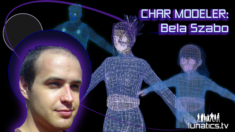 The task of converting the set of modelsheets drawn by Daniel Fu to 3D character models is a pretty tricky one. It requires a definite artistic sense of form in 3D, the ability to follow an inexact pattern, and of course, a great deal of skill with Blender.Three different modelers have created character models for Lunatics! However, it was Bela Szabo who established the basic models for the main characters, and really set the standard for how they would look.