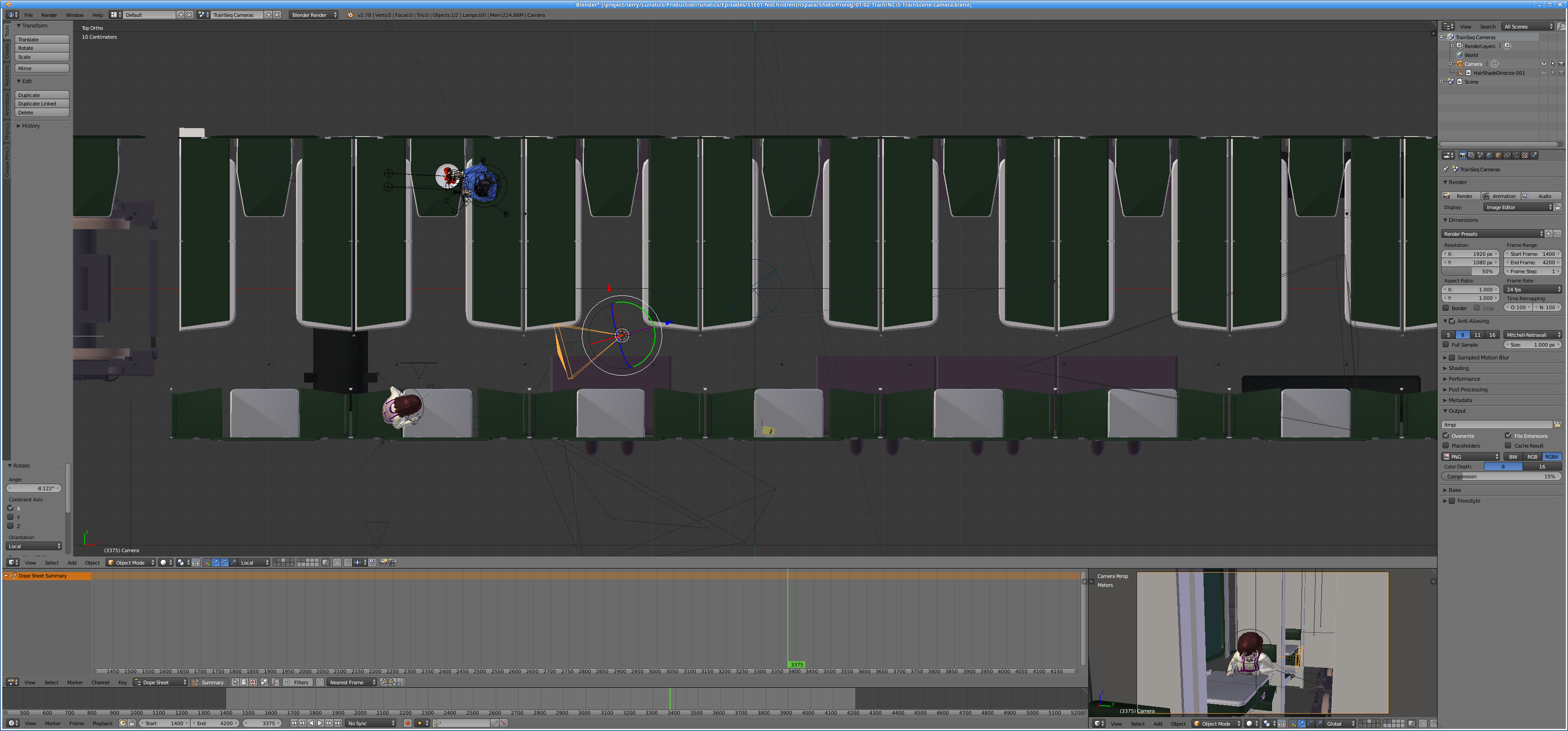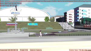 A test render of animation sequence of Georgiana skipping down the sidewalk in front of the train station. Part of a montage of Hiromi and Georgiana seeing the town the day before they leave for the cosmodrome.