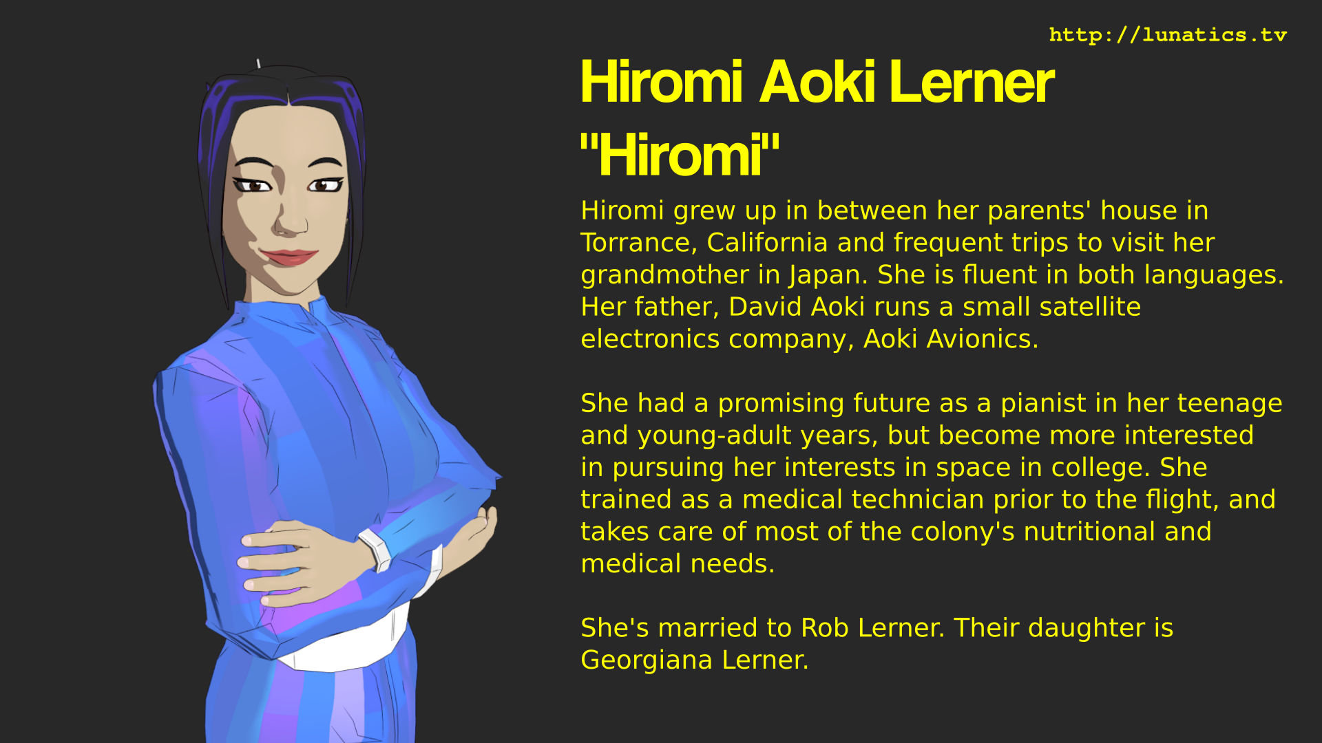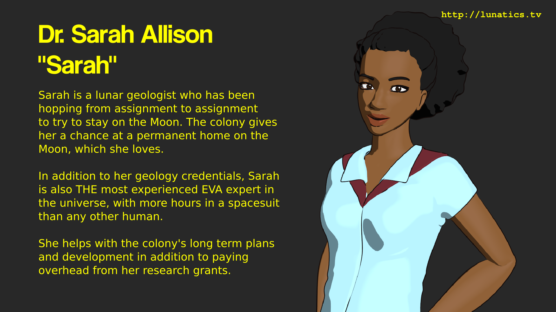 Joining the colony at the end of what is now the fifth episode, Sarah Allison brings some science into the show. Her primary interest is in lunar geophysics and the evolution of the landscape. She’s also the most experienced person alive at working in a spacesuit, and she combines that experience with Hiromi and Rob’s skills to work on improved designs later in the series.
