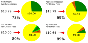 The recent proposal from Patreon is shown in the upper right: this not only transferred fees from the Creator side to the Patron side, thus increasing the total paid, it increased the transaction fees by returning to the same sort of separate subscription model that you could have done directly through PayPal before. But now, of course, Patreon’s cut makes it a worse deal: only 69% gets through. That’s starting to look pretty bad!