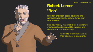 Robert Lerner is the founder of the organization that sponsors the colony in “Lunatics!” and one of the first group of colonists on the Moon. He’s an engineer and a visionary who tends to see problems in technical terms.