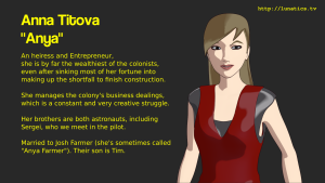 Anya is the colony’s business manager, a role she’s very well prepared for, having built space businesses of her own on Earth. She provided much-needed funding to reignite the project in the mid to late 2030, resulting in the colony starting up in 2040.