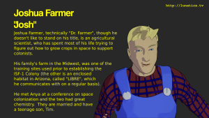 Though he likes to call himself a “farmer”, it would technically be more accurate to call Josh an “agricultural scientist”. He has long been interested in the problems involved in raising food and fiber crops in space to support colonization, and the colony is relying on him to make it work.