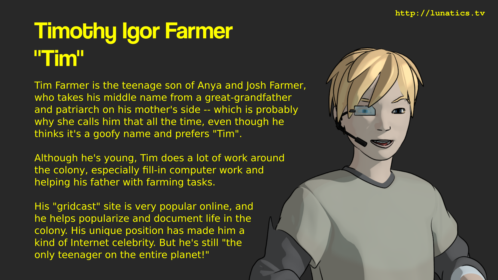 Tim Farmer, the son of Josh and Anya, is, as he says, “the only teenager on the entire planet”. He’s very active online and has a lot to do in the colony, but feels deprived of social opportunities.