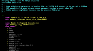 Decided to just get started on a TACTIC installation, using Ansible. It’s a lot of picky dependencies and the documentation appears to be years out-of-date with respect to the code. So this may be kind of tricky.But at least I know my way around Python code and installations — I think I have a fighting chance to get this right!