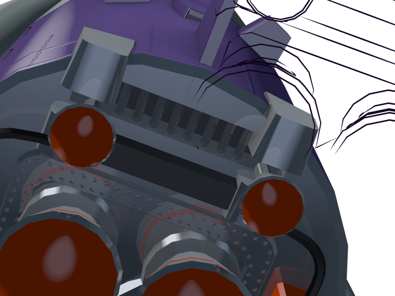 I’m now getting the Launchpad mech properly linked into the Launchpad-Ext set. The lighting problem from yesterday appears to have been materials not having the “cast alpha shadows” option set (because of the “cloud” layer) A number of things could be detailed better in this render: