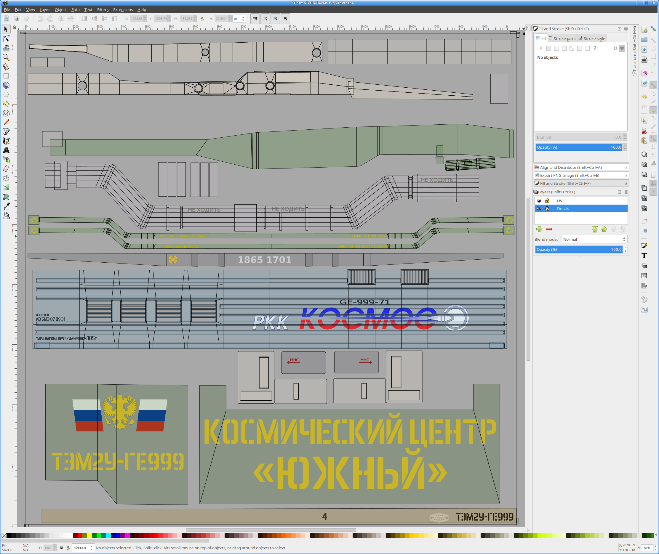 I’ll use separate auto-generated UV maps for the Ambient Occlusion baking. After doing those manually for the launch vehicle, I realized that they don’t really need much editing — and what I was doing was mostly correcting for bugs that arise because of bad UV mapping (the AO bake produces weird results for surfaces that overlap in UV space).This time, I thought it would be convenient to just use one “decals” image for all the cars, especially since I only need a partial UV map to do this with. So I exported each partial UV map to a file — the significant parts you can see easily here, but I also exported a small extra face, which I lined up with the edges of the UV mapping image to get them registered correctly in Inkscape, which is what we’re looking at here.