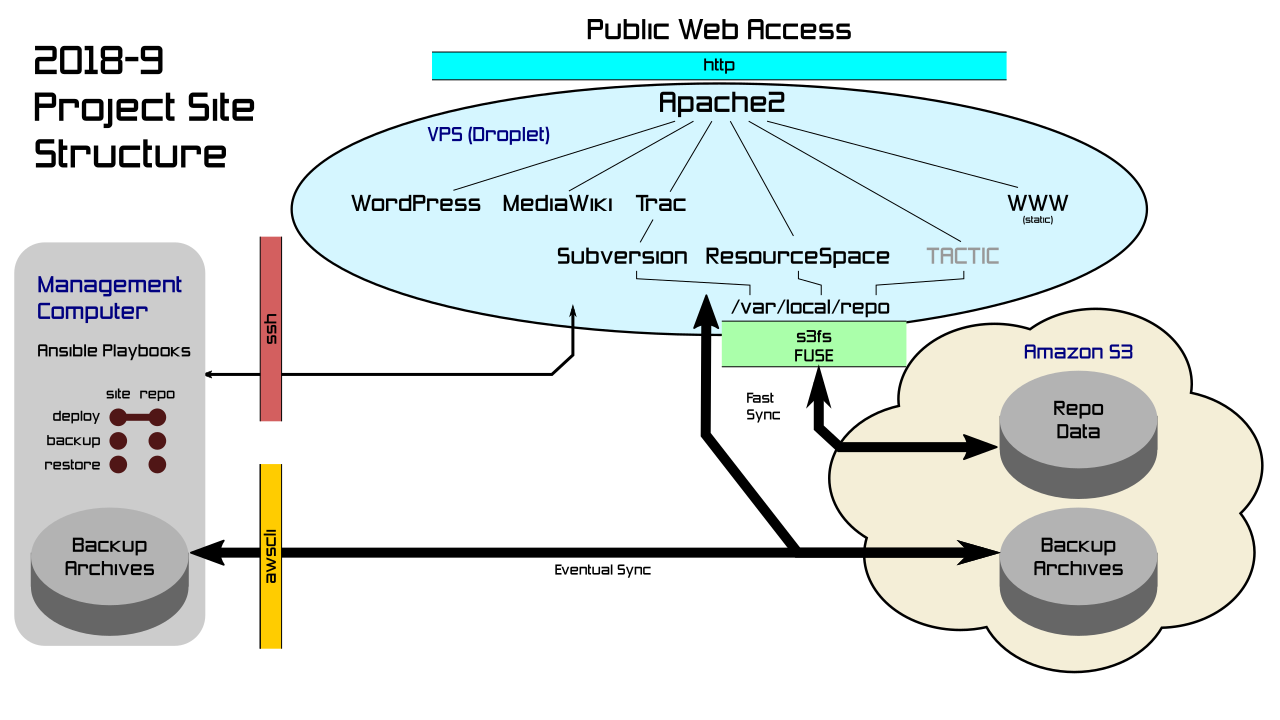 Today I’ve been testing deployment of our site onto a Digital Ocean “droplet” VPS and using Amazon “S3” storage for backups and repository data. This is a diagram of where I’m heading with this, although it’s not quite all working yet: